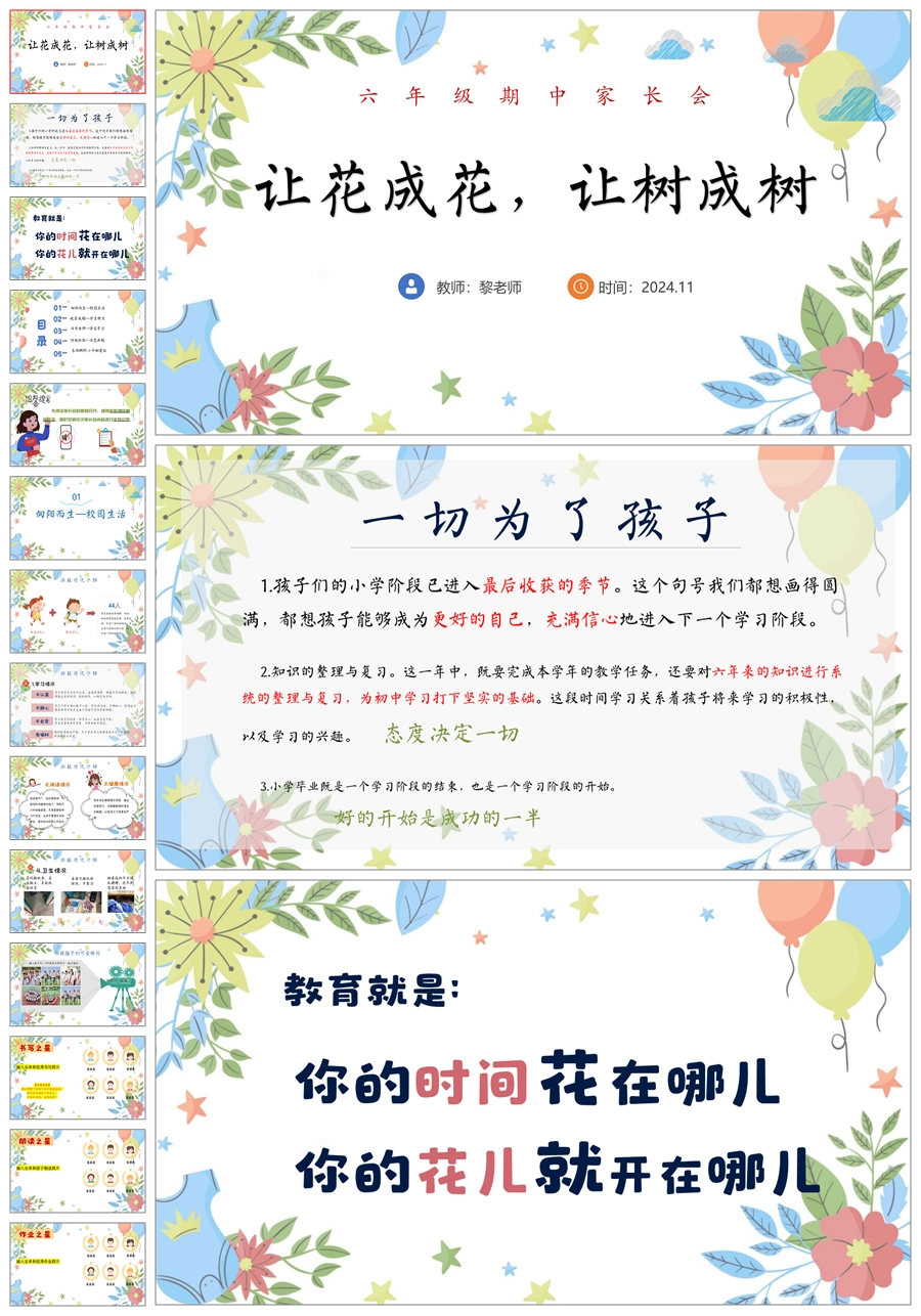 【5112】六上语文期中家长会《让花成花让树成树》》六年级上学期期中家长会ppt课件+发言稿+暖场视频