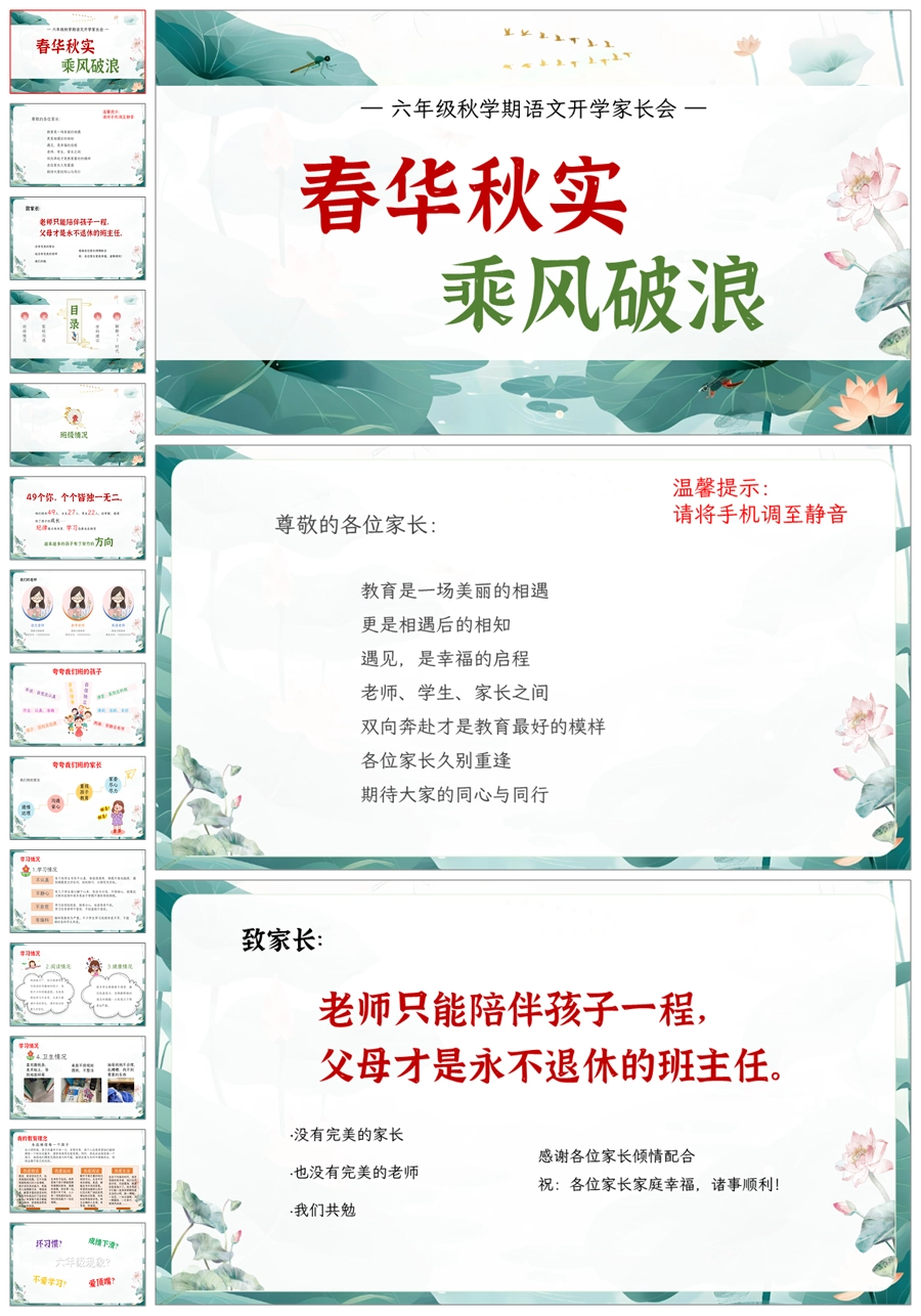 首页 六年级家长会 【5181】【六上】【语文】【春华秋实,乘风破浪】六年级上学期开学家长会PPT课件+发言稿