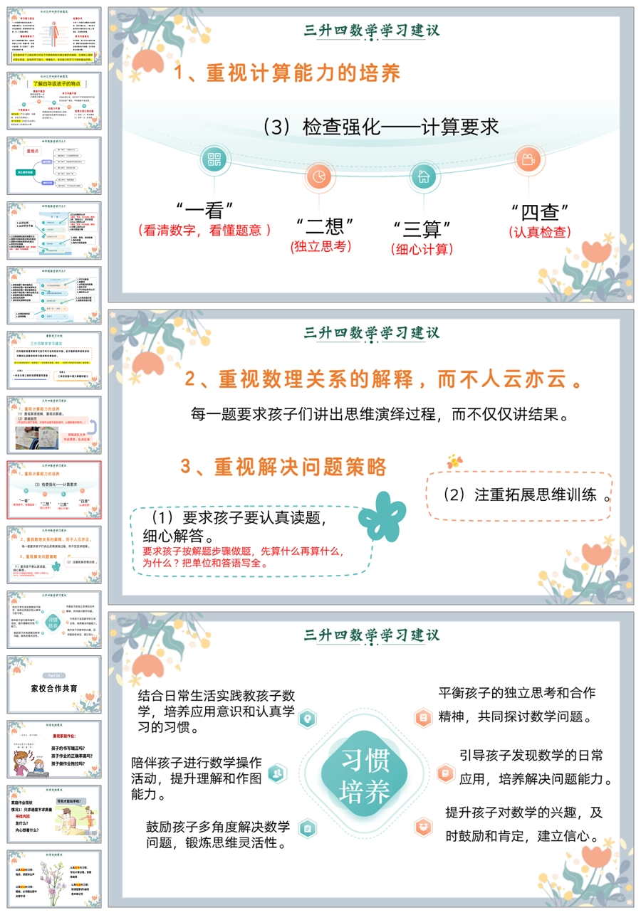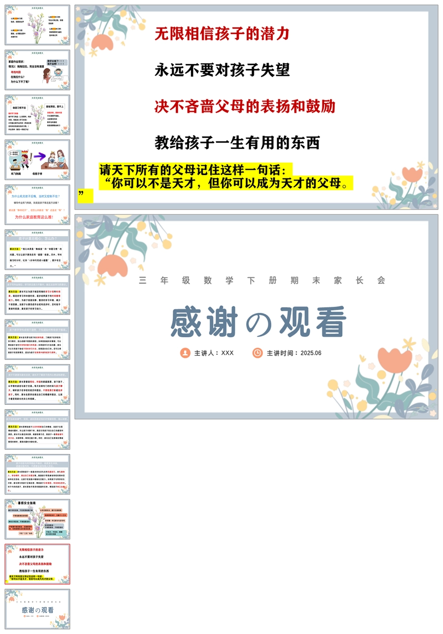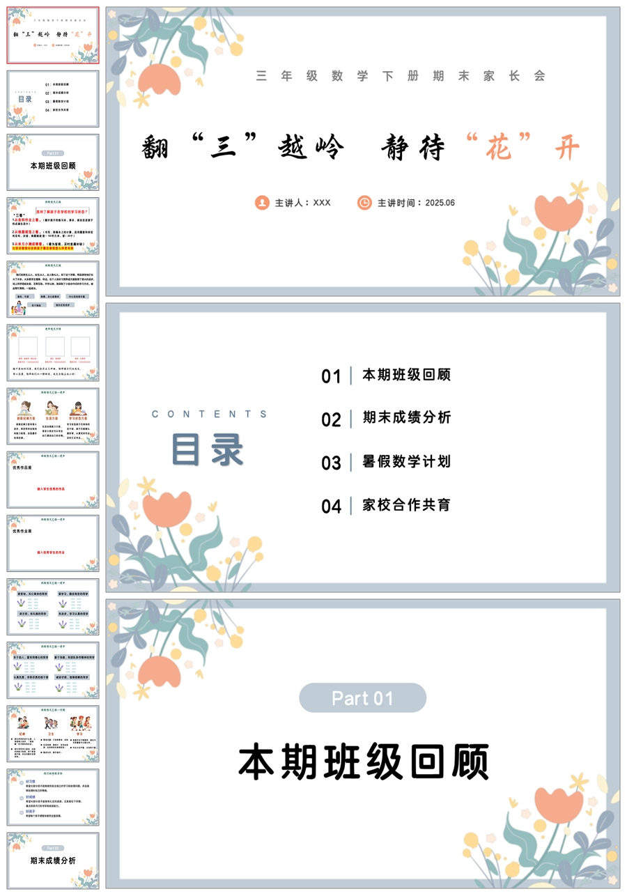【5321】【三下】【数学】【翻“三”越岭 静待“花”开】三年级下学期期末家长会PPT课件+发言稿