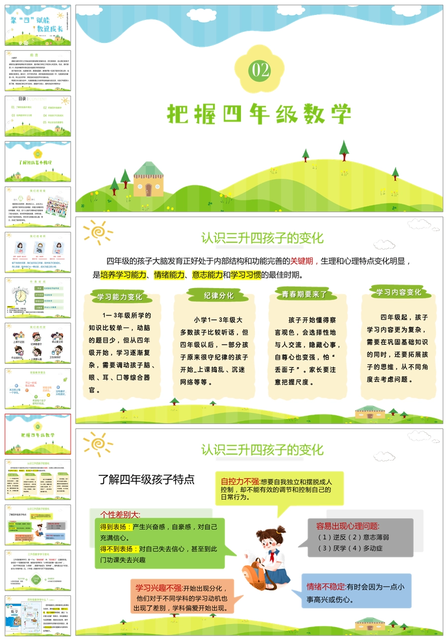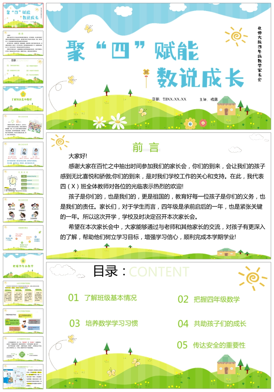 首页 四年级家长会 【5349】【四上】【数学】【聚”四“赋能 “数”说成长】四年级上学期开学家长会 - 北师大版PPT课件+发言稿