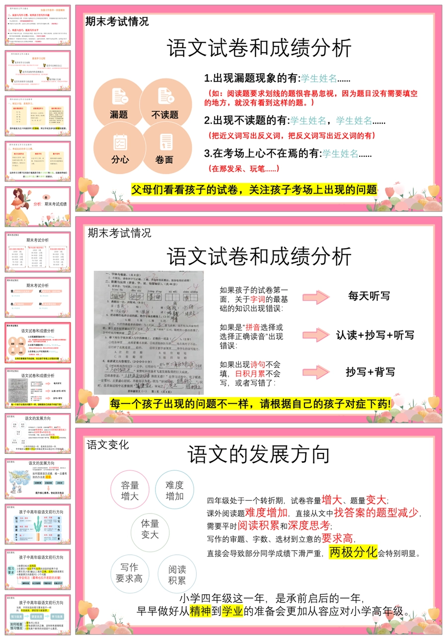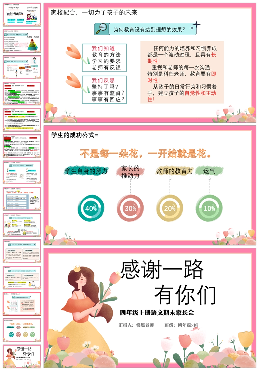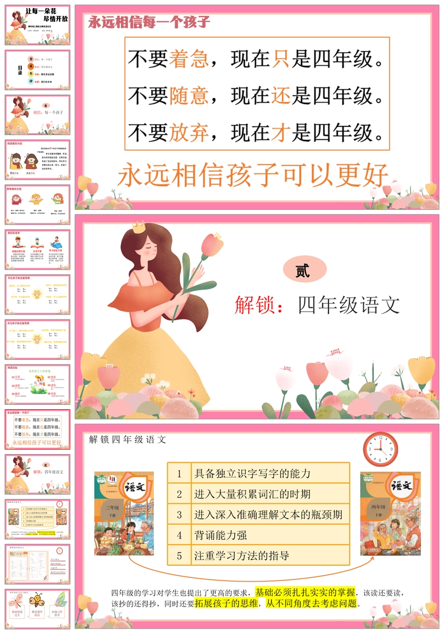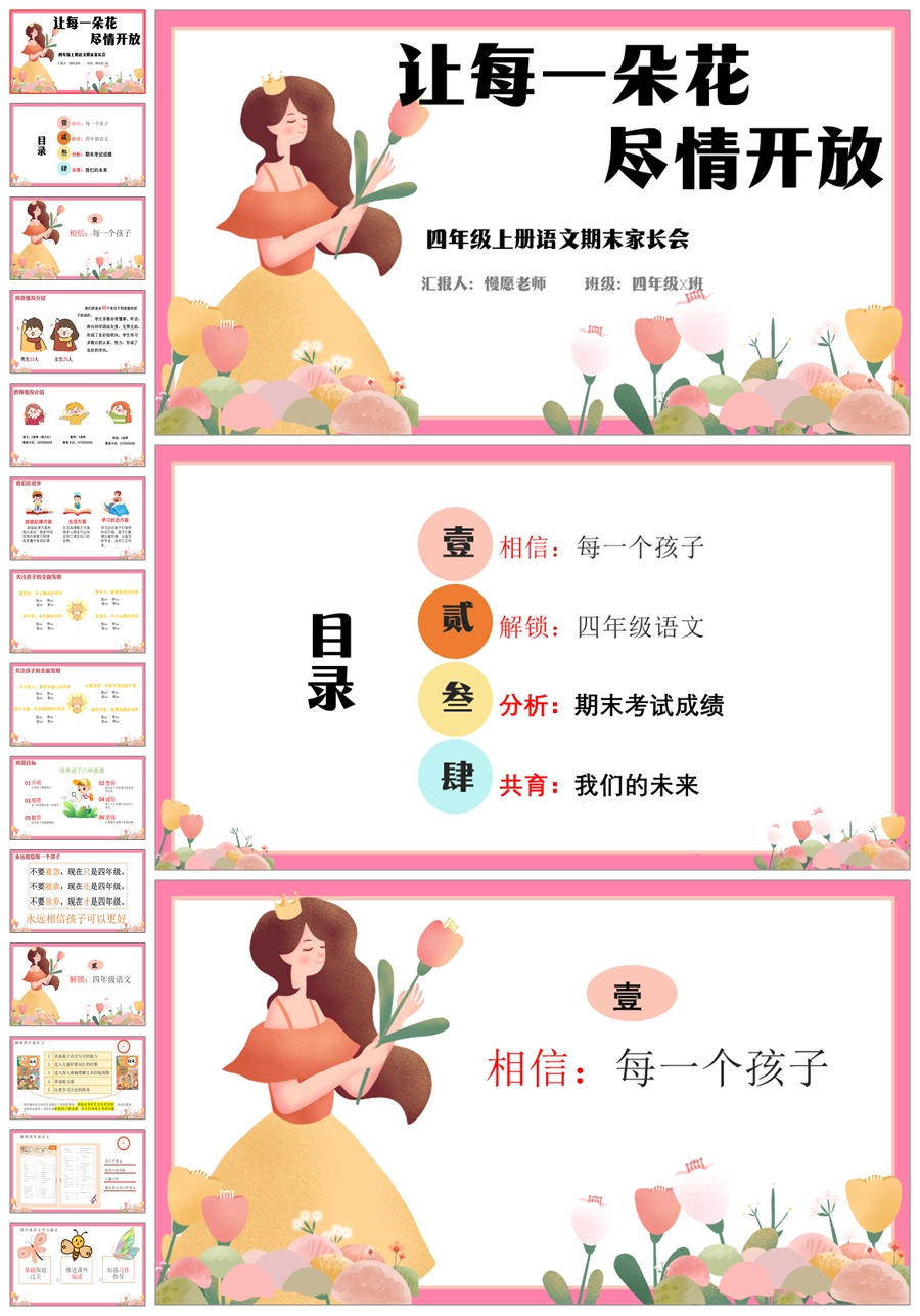 首页 四年级家长会 【5358】【四上】【语文】【让每一朵花尽情开放】四年级上学期期末家长会PPT课件+发言稿