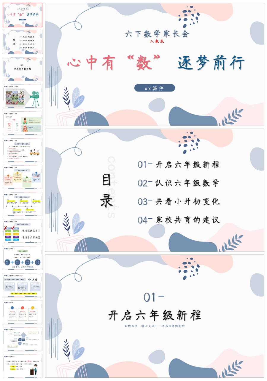 首页 六年级家长会 【5414】【六下】【人教版版数学】【心中有“数”,逐梦前行】六年级下学期家长会PPT课件+发言稿