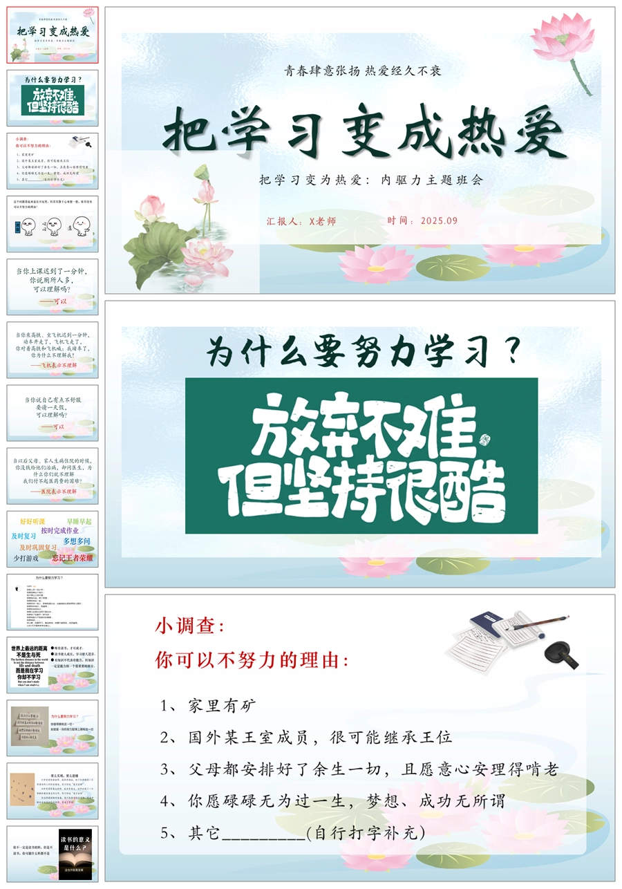 【5426】《把学习变成热爱》励志主题班会ppt课件+发言稿