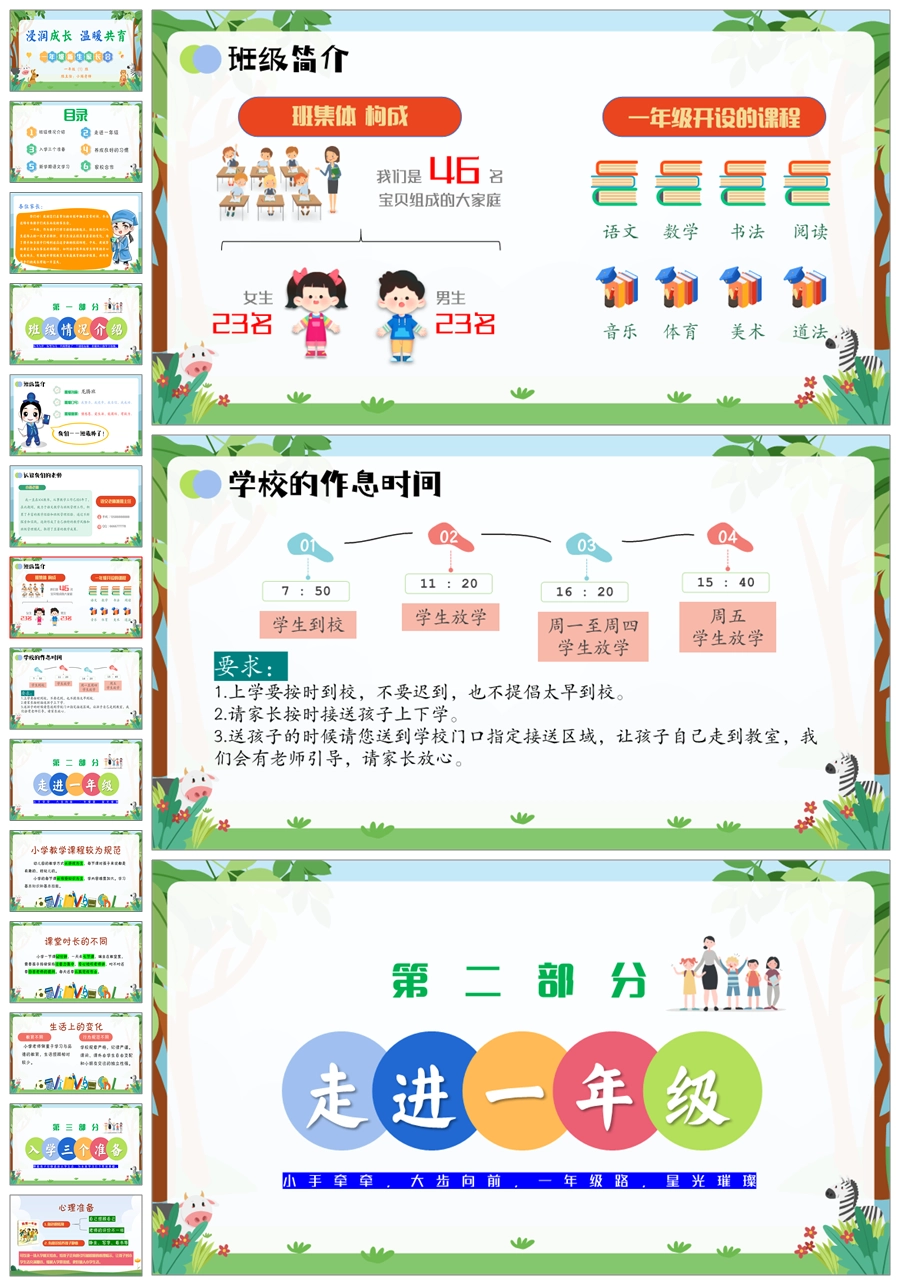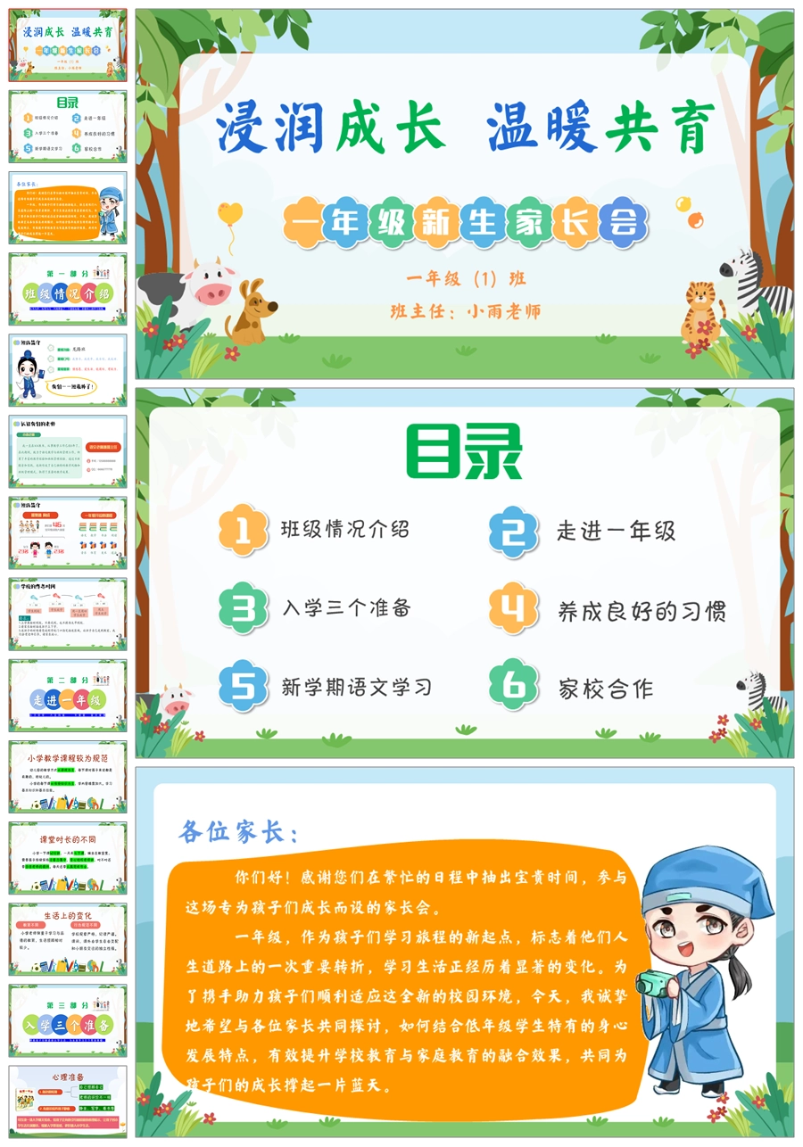 【5469】一年级新生家长会《浸润成长温暖共育》一年级新生入学家长会ppt课件+发言稿