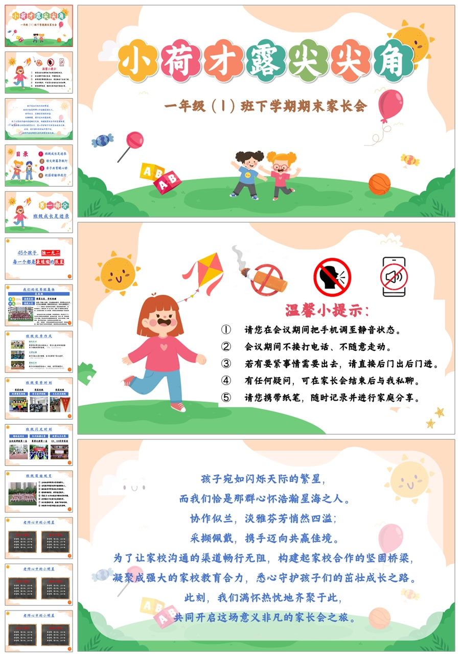 【5482】一下语文期末家长会《小荷才露尖尖角》一年级下学期语文家长会ppt课件+发言稿+暖场视频