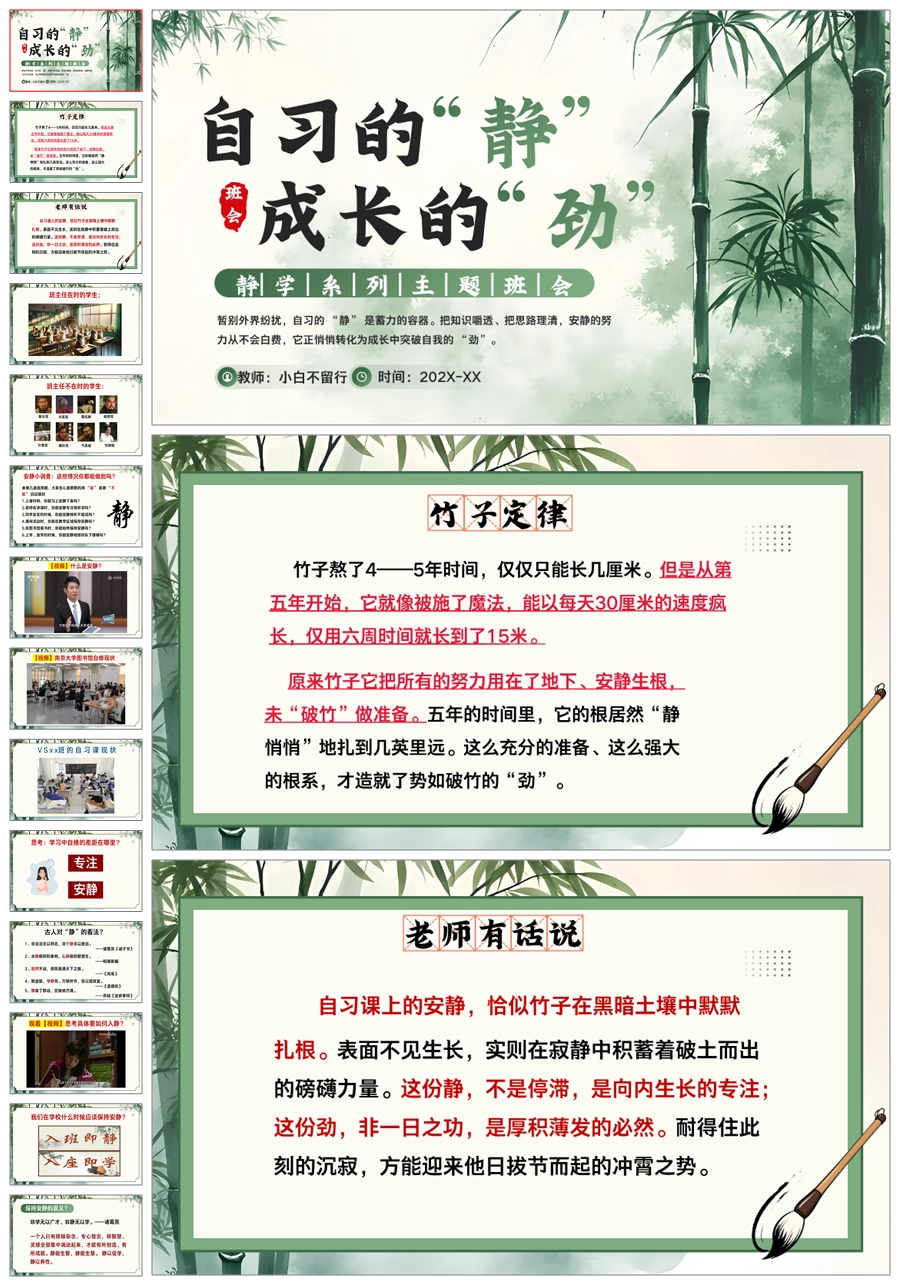 【5583】《自习的静成长的劲》竹子定律班会励志主题班会PPT课件+发言稿