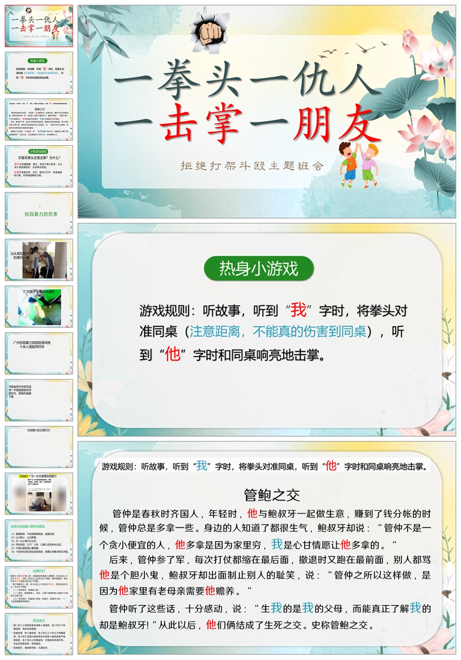 【5572】《一拳头一仇人,一击掌一朋友(荷花)》拒绝打架斗殴主题班会PPT课件+教案+视频