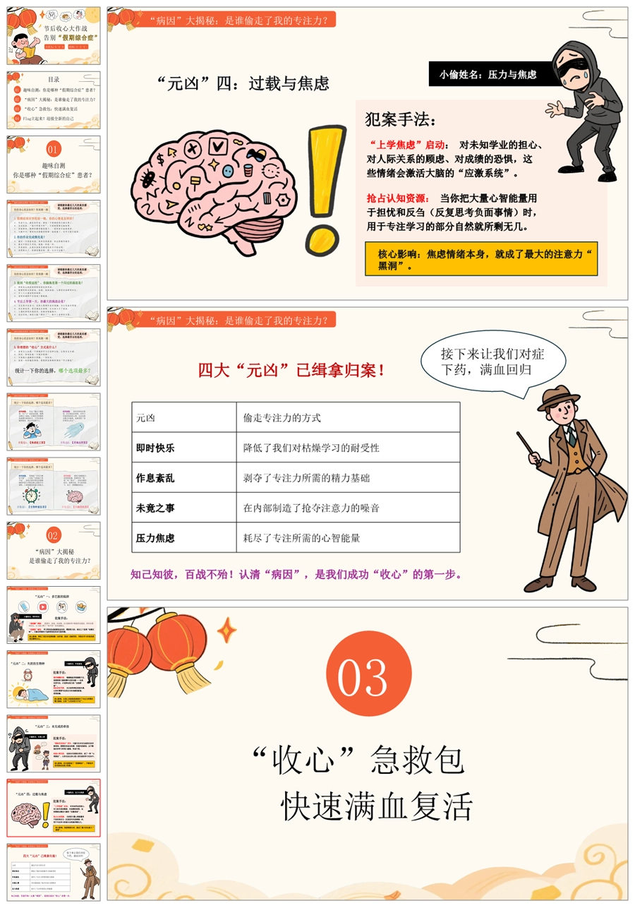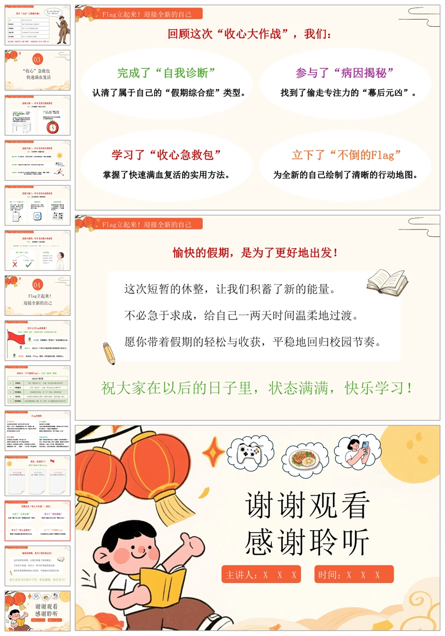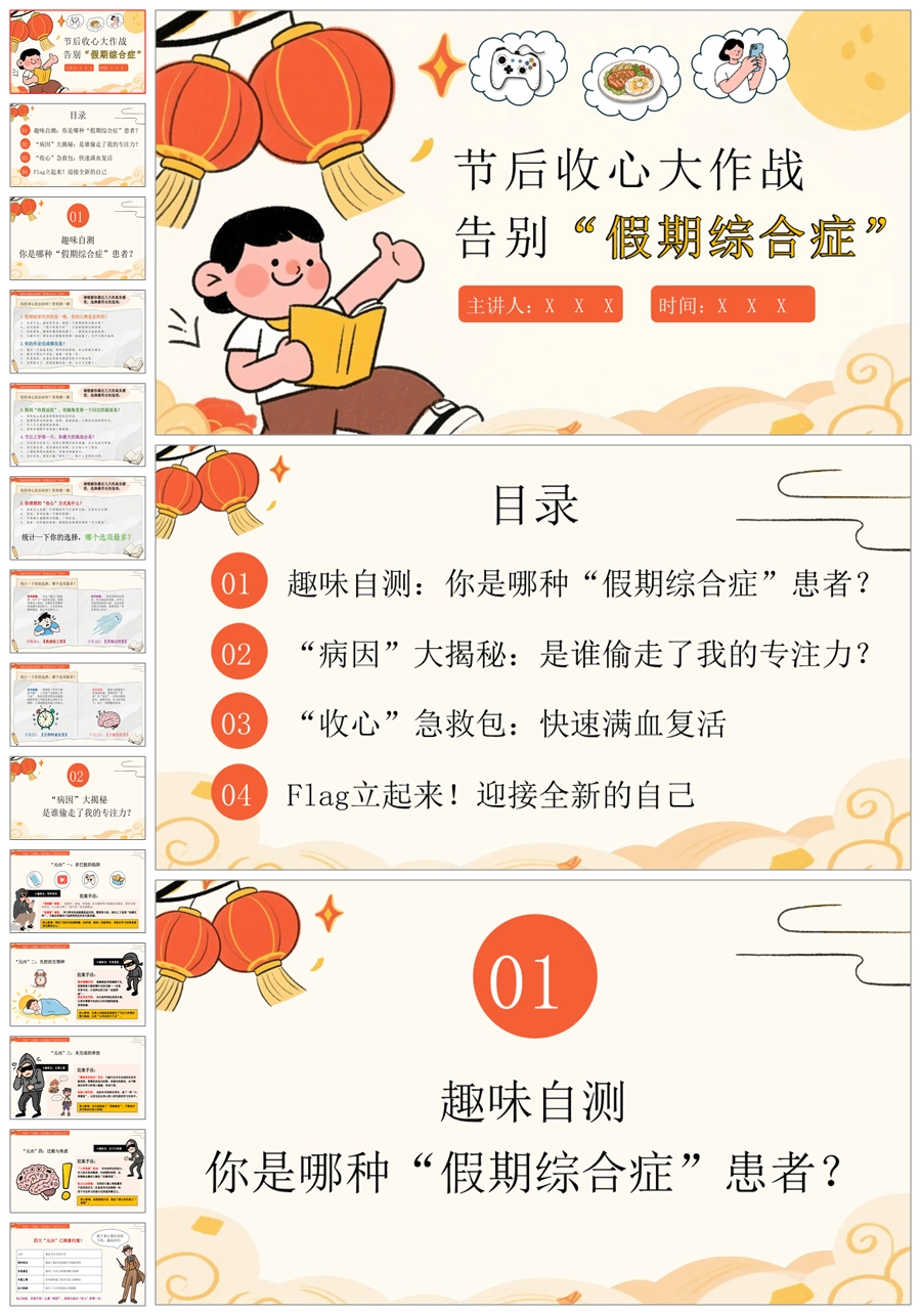 【5667】《节后 “收心” 大作战:告别假期综合症》假期收心主题班会PPT课件+教案+发言稿
