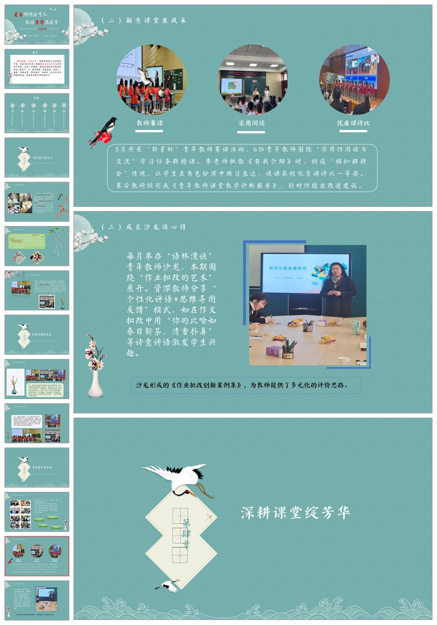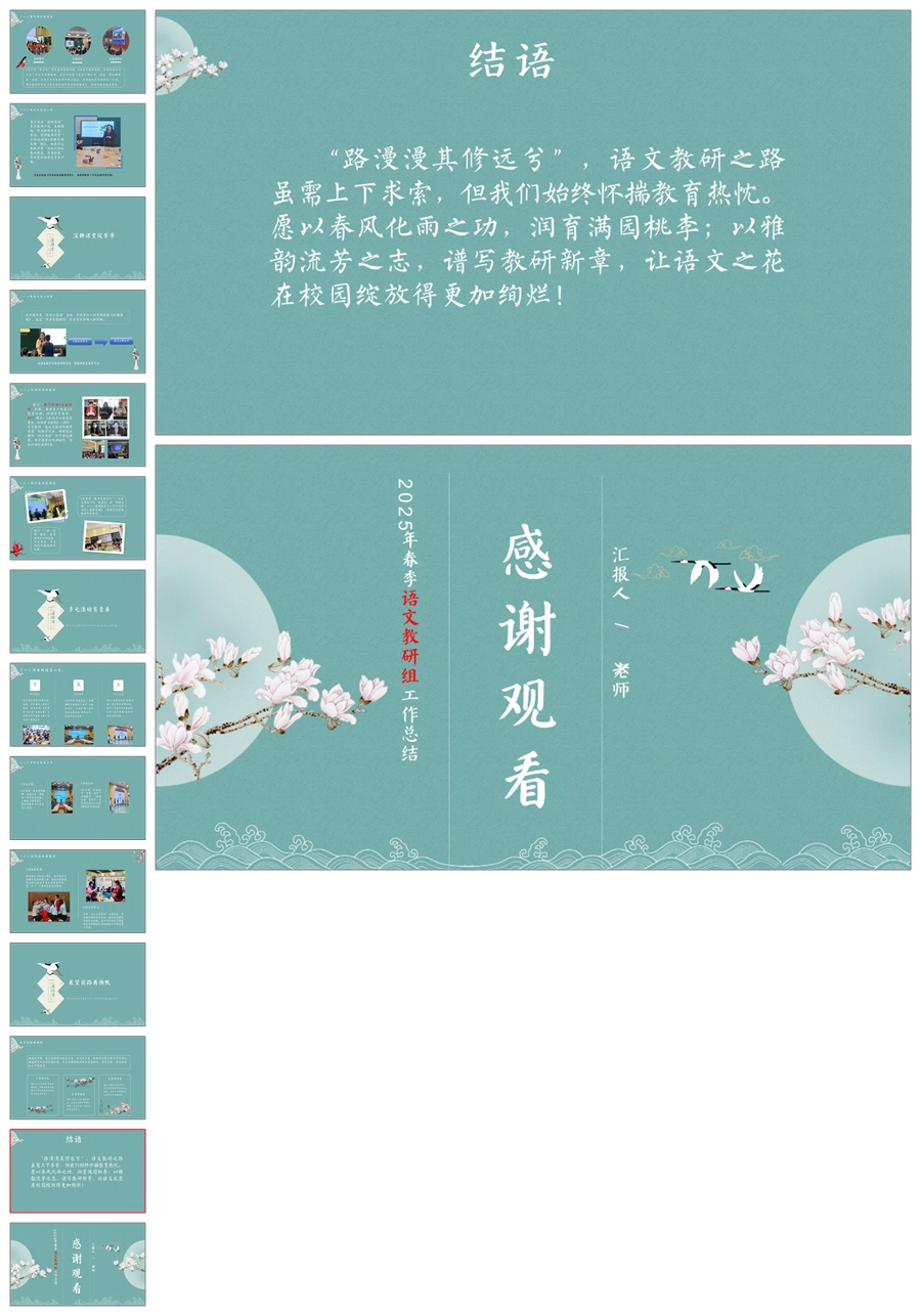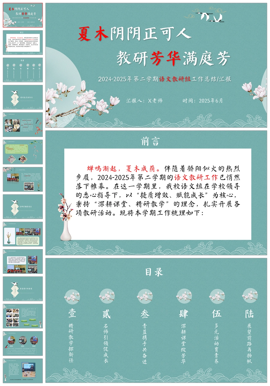 【5706】学校语文教研组工作总结《夏木阴阴正可人,教研芳华满庭芳》ppt课件+发言稿