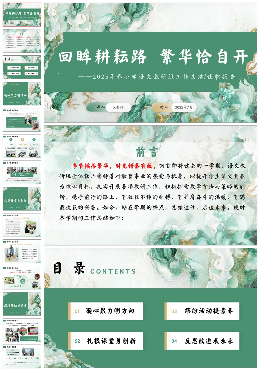 【5708】学校语文教研组工作总结《回眸耕耘路 繁华恰自开》ppt课件+发言稿