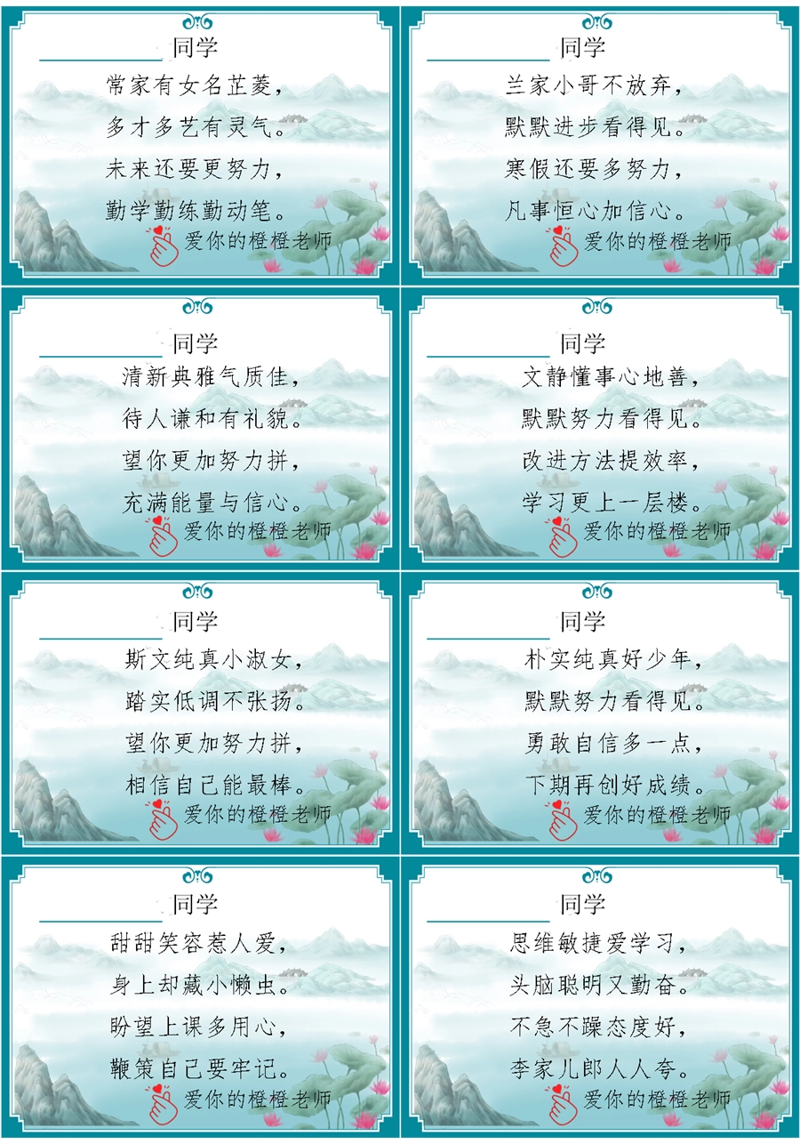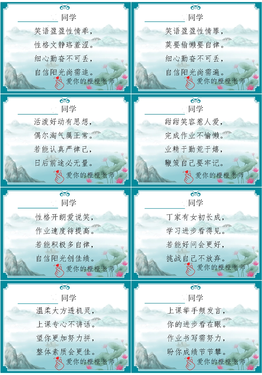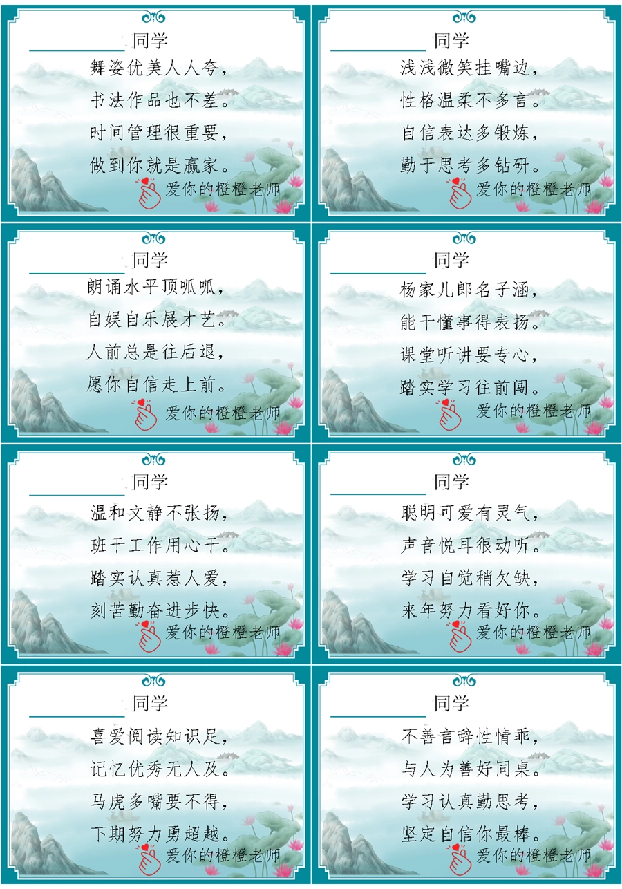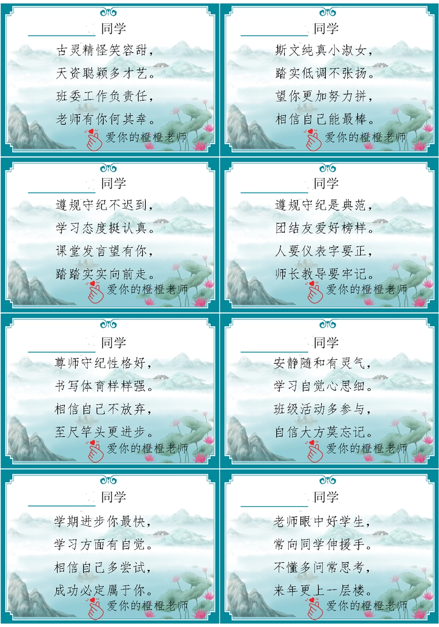 【期末学生评语】【打油诗】72则创意期末评语-每页8张