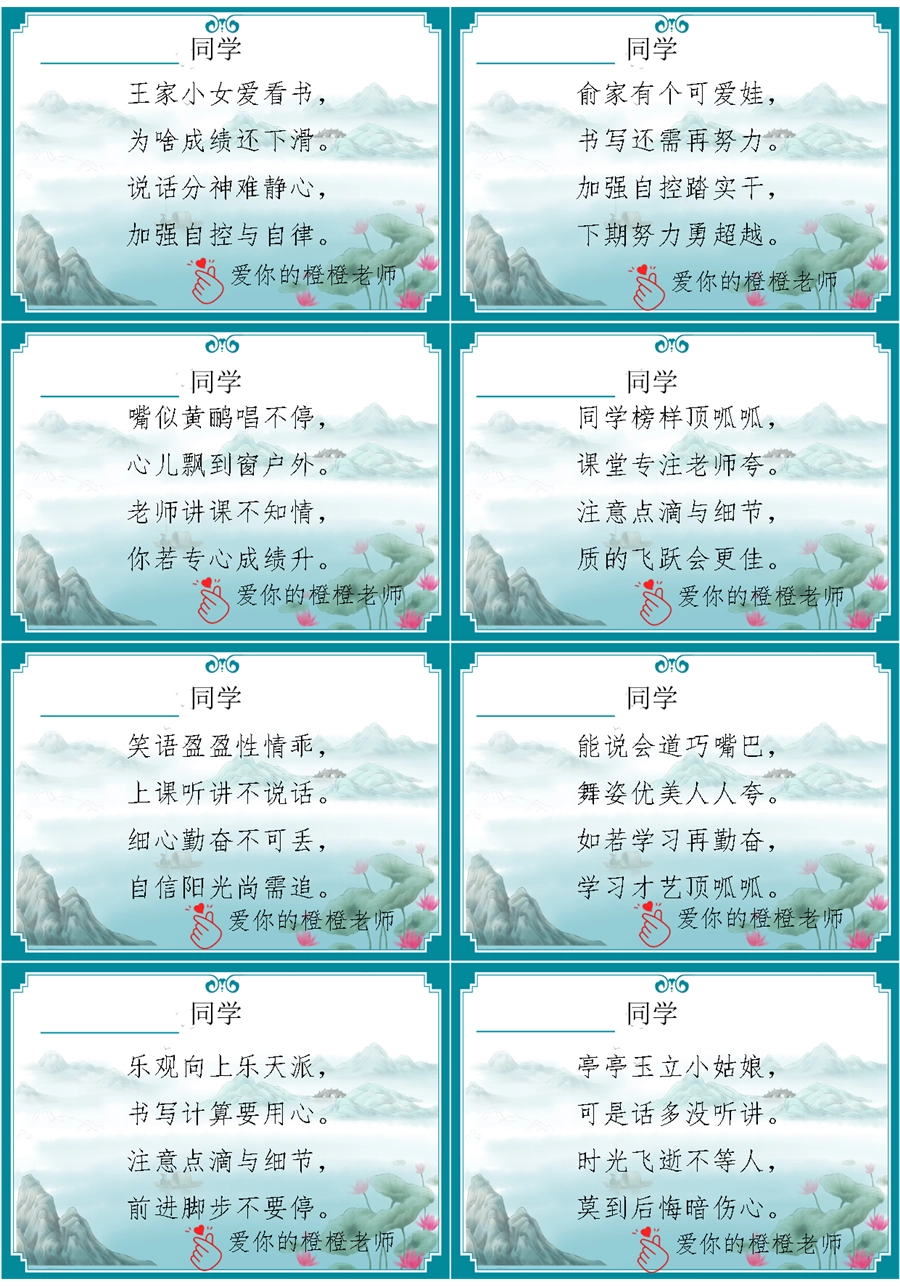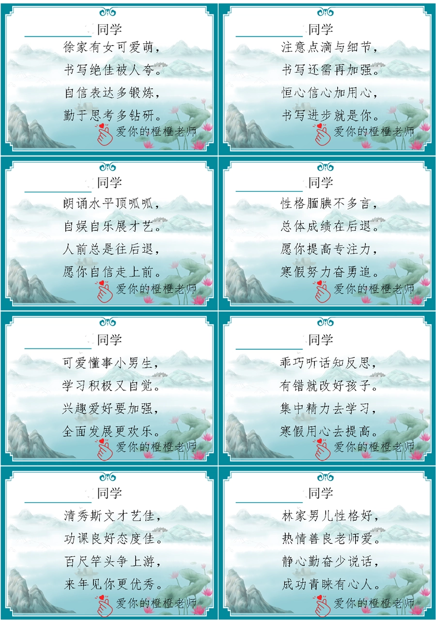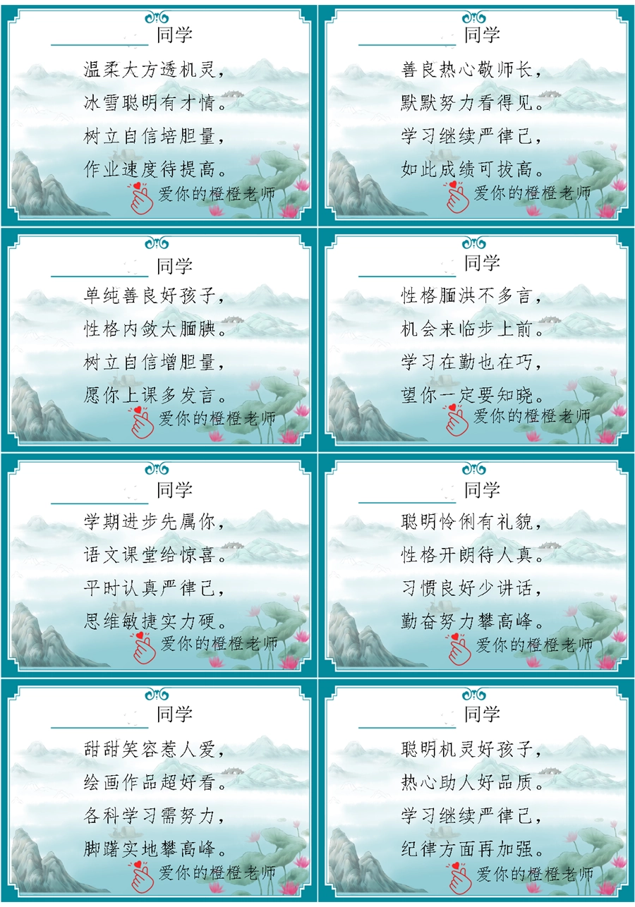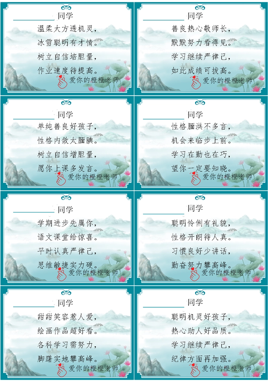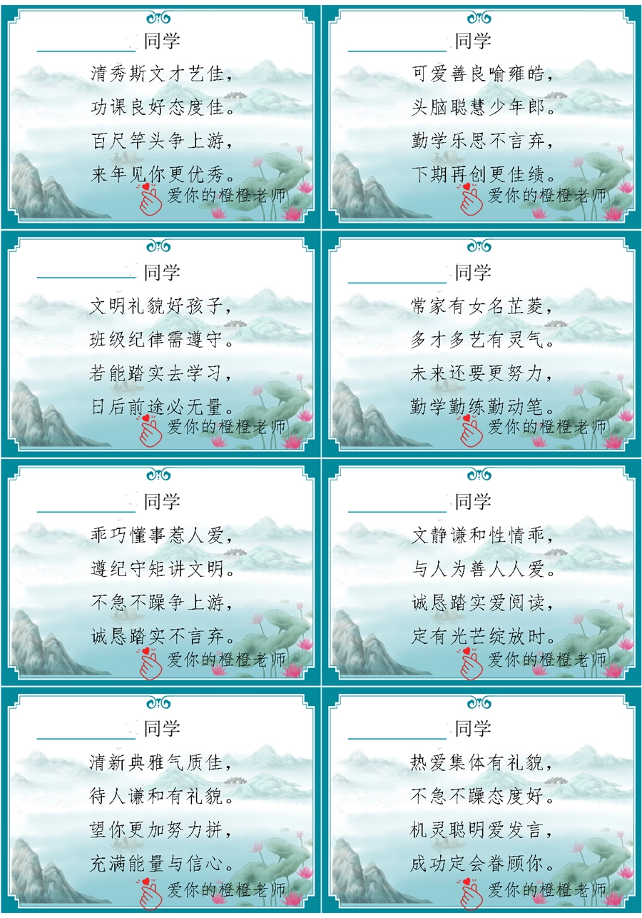 【期末学生评语】【打油诗】72则创意期末评语-每页8张
