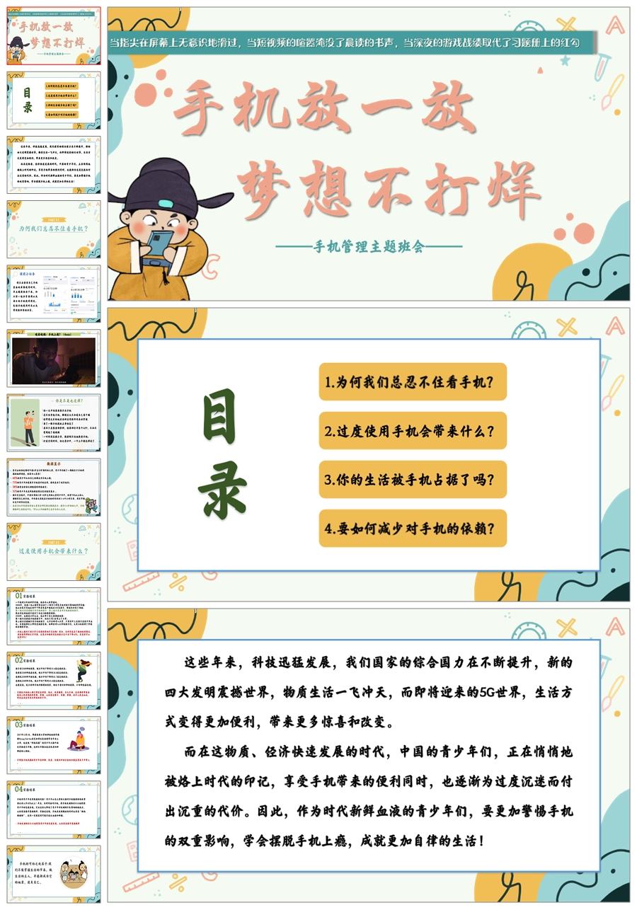 【5827】《手机放一放,梦想不打烊》手机管理主题班会PPT课件+视频+承诺书+教案