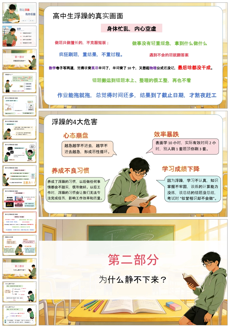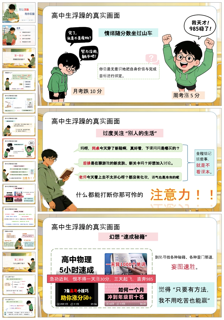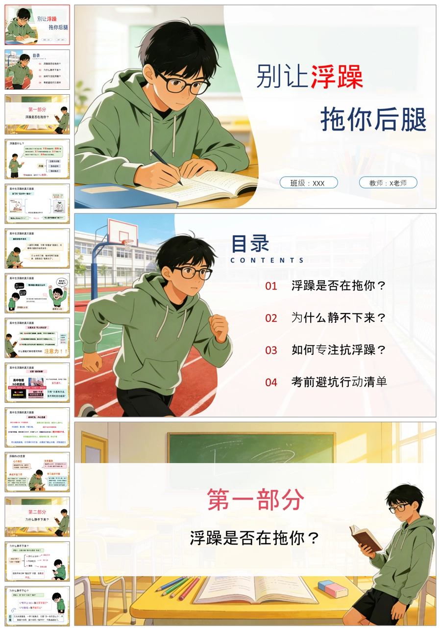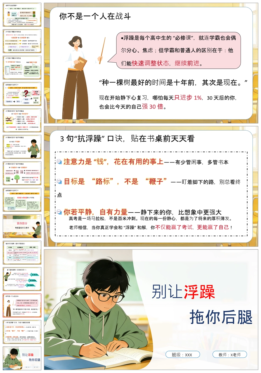 【5886】高中考前复习指导主题班会《别让浮躁拖你后腿》PPT课件+教案+发言稿+表格