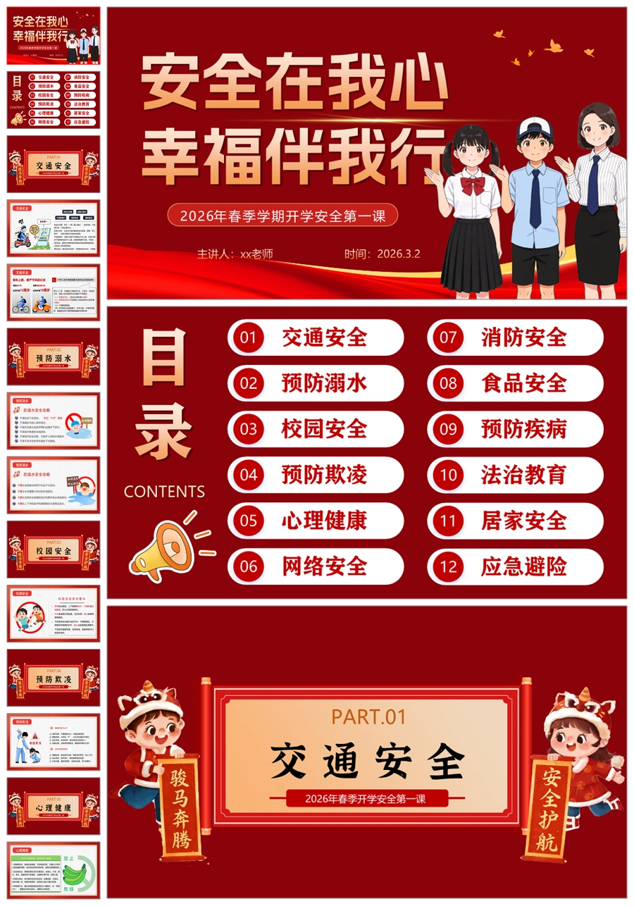 【8665】《安全在我心幸福伴我行》2026年春季开学安全第一课PPT课件+教案+发言稿