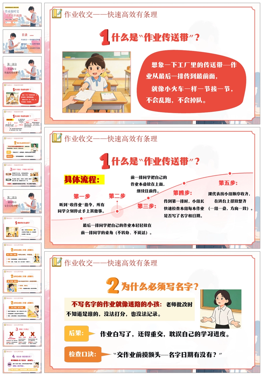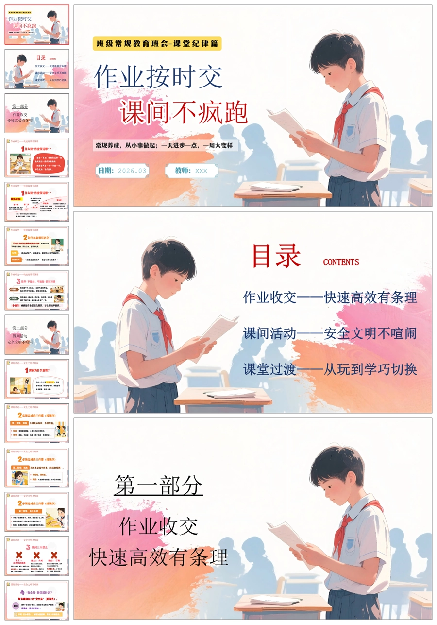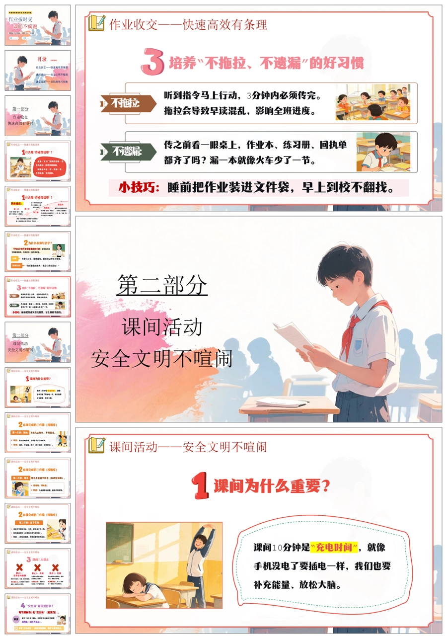 【6054】《作业按时交·课间不疯跑》班级常规教育学习指导小学主题班会PPT课件+教案