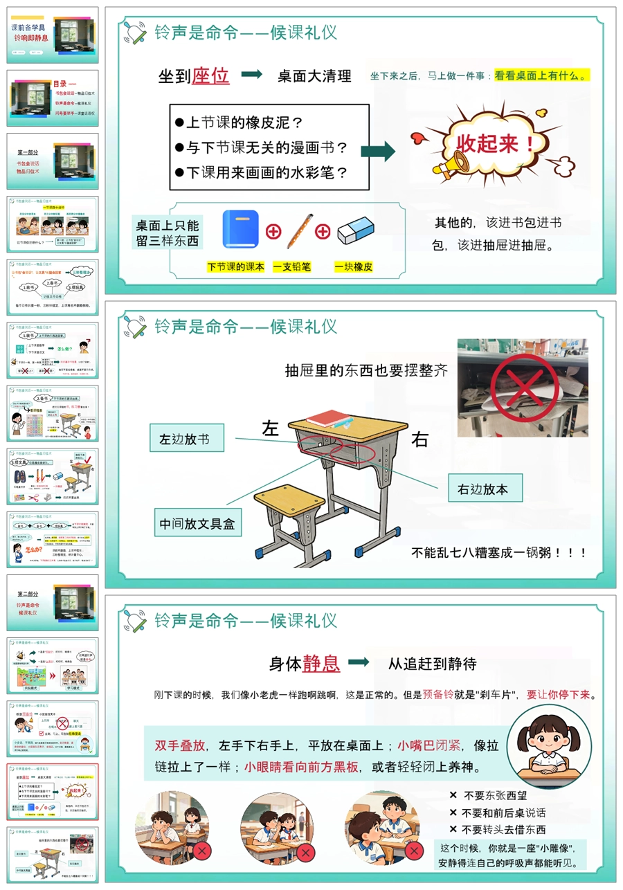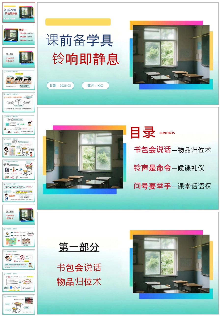 【6063】《课前备学具·铃响即静息》班级常规教育小学主题班会PPT课件+教案