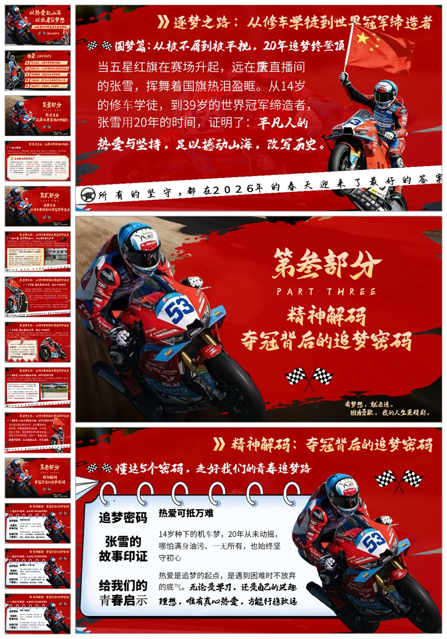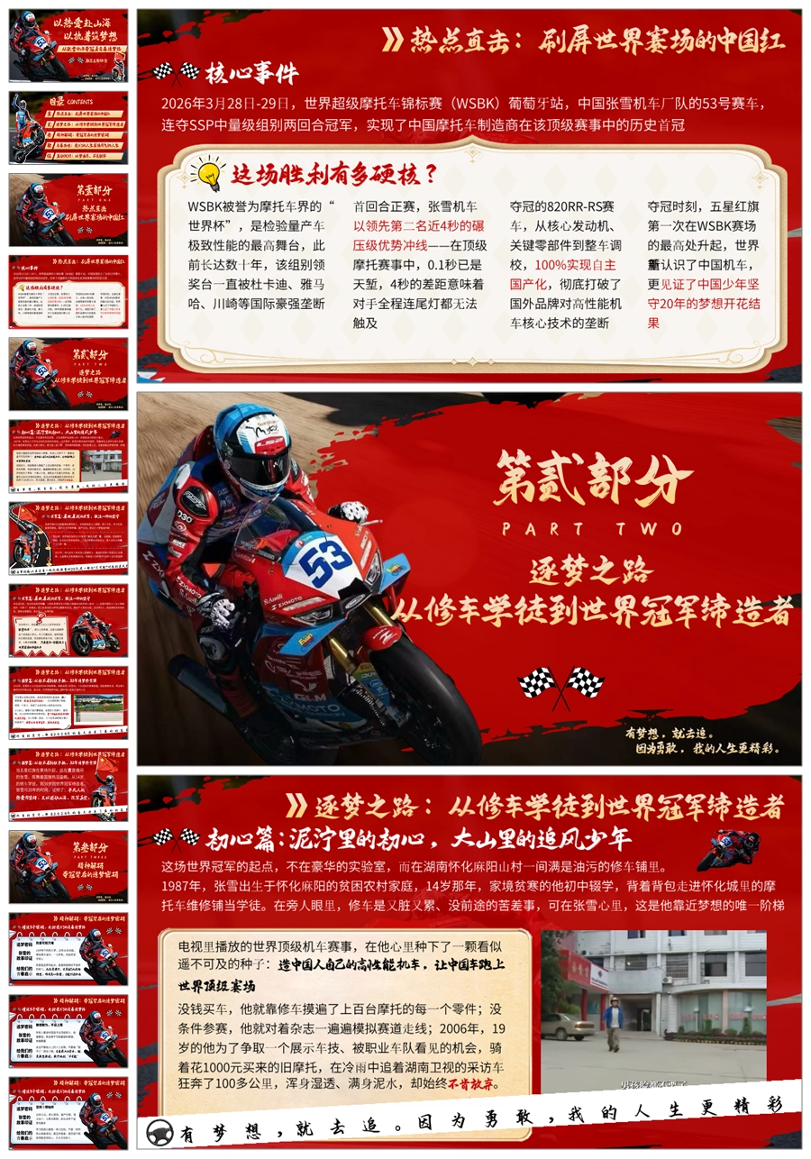 【6119】《从修车铺到世界冠军》张雪机车世界夺冠的追梦启示励志主题班会PPT课件+教案+视频+逐字稿