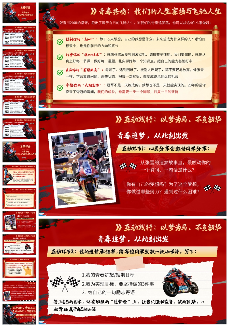 【6122】《以热爱赴山海 以执着筑梦想——从张雪机车夺冠看青春追梦路》励志主题班会PPT课件+教案+演讲稿